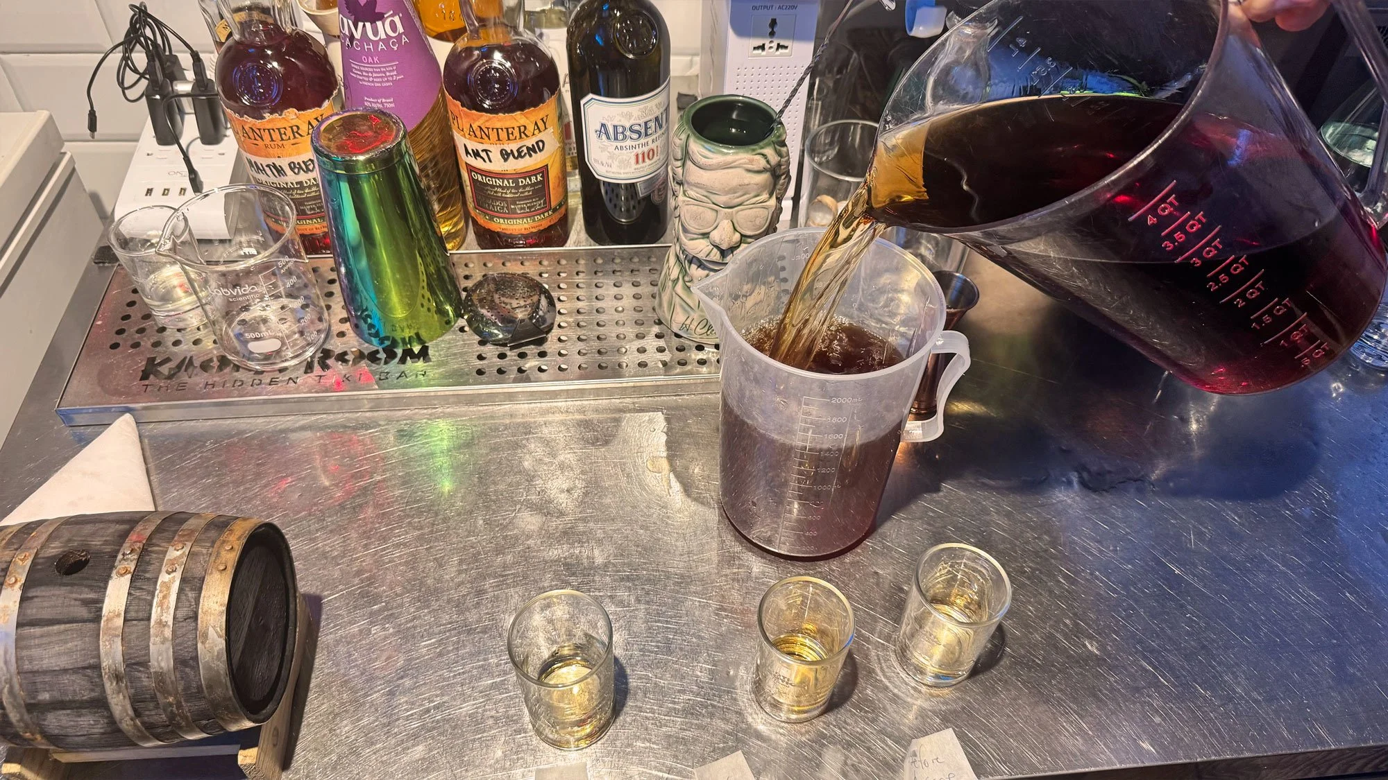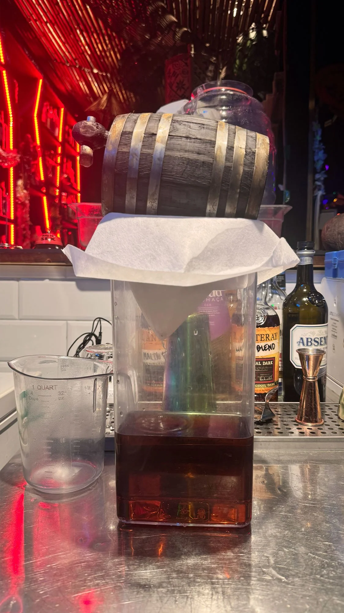 Of the four barrels, one of them started to leak when the vacuum was broken, so we had to return the filtered whiskey to it’s original bottle least it leak out slowly over the next few days. 3/4 barrels maintaining integrity is less than ideal, but not an issue when it happens in the lab. We’ve found that the natural process of underwater aging allows for a compromised barrel to rentain a perfect seal against the seawater until it’s internal pressure is relieved so we’re regularly able to save the full yield.