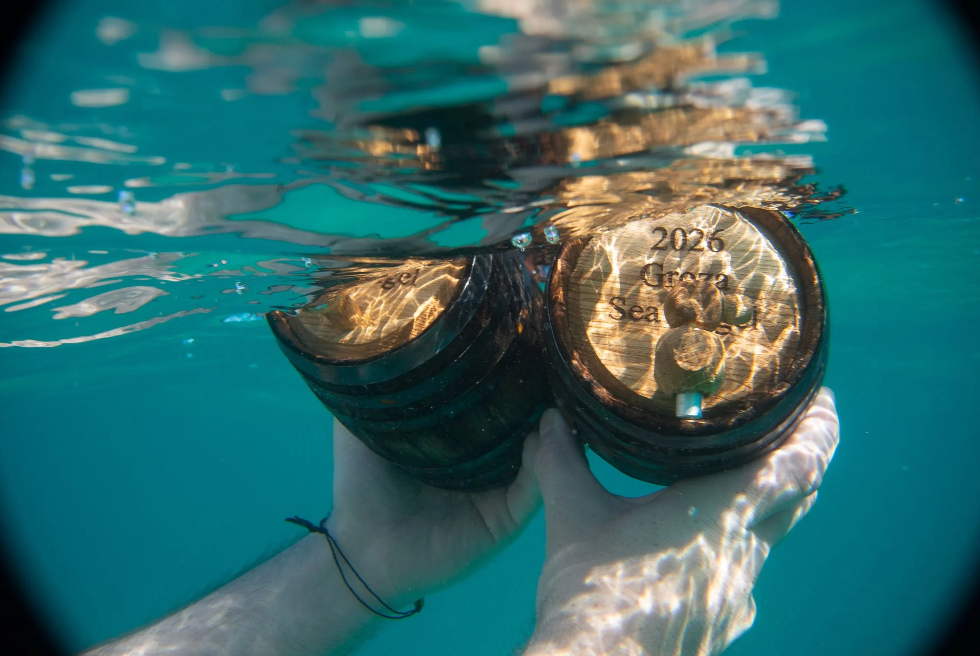 Fast forward through the month and we shot back out on the kayaks to retrieve the barrels. Back in the lab, we tapped and filtered each barrel separately to make sure they all came out clean. There’s nothing worse than realizing you’ve just inadvertently dumped a barrelfull of saltwater into an otherwise perfectly good yield. Thankfully, all 4 came out clean. The time underwater had imparted a slightly richer color to the naturally light Angel’s Envy, and the aroma was a notably sweeter nose with just a faint hit of sea breeze. On the palate however we instantly saw the real impact of the submersion: the typically light and smooth flavor of the port barrel-aged bourbon had taken on a deeper and creamier quality with a pronounced salinity on the tail end.